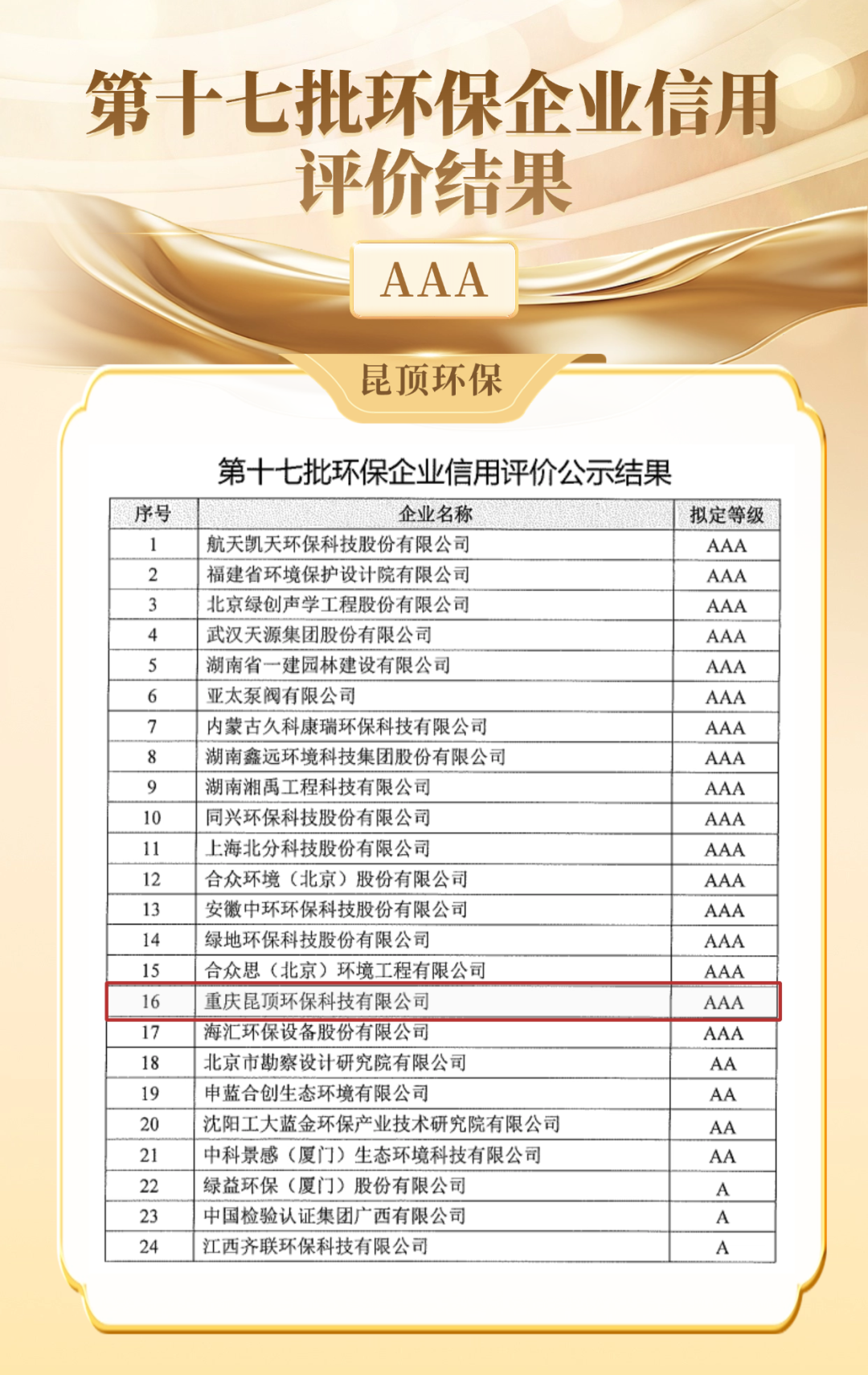 近期,中國環(huán)境保護產(chǎn)業(yè)協(xié)會公布第十七批環(huán)保企業(yè)信用評價結(jié)果。昆頂環(huán)保在此次評選中脫穎而出,榮獲最高信用等級——AAA級。