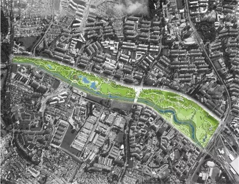 該方案在一個泛濫平原理念的基礎(chǔ)上設(shè)計,當(dāng)水位低時,人們能夠在寬闊的河岸沿線親近水、享受休閑活動,而在暴雨時期,河流附近的公園綠地成為一條運(yùn)輸線路,運(yùn)送下游的水流,在公園內(nèi)進(jìn)行多種土地利用,為公共活動建造出更多的空間。