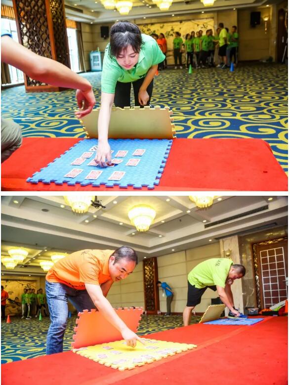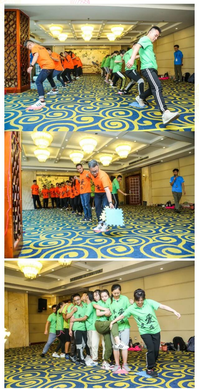 兩組各12名隊員,需要借助6塊墊子通過“亞馬遜河流”,要求不能有一人落水的同時還得將小船安全運送到對岸。這個項目考驗大家的協(xié)作能力與創(chuàng)新能力,如何在困境面前,利用有限的資源,解決困難。