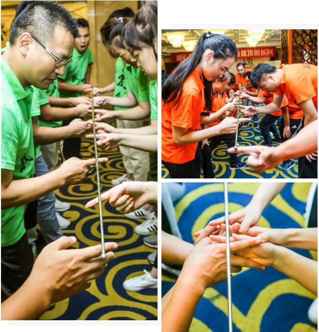 大家共同用食指支撐魚竿,不能有人手指離開魚竿的情況下將魚竿從頭至尾放到地上。取名簡單任務實則一點也不簡單,不允許有任何人出現(xiàn)失誤,一人不動則整體不動,一人動作快則導致整體分崩離析。